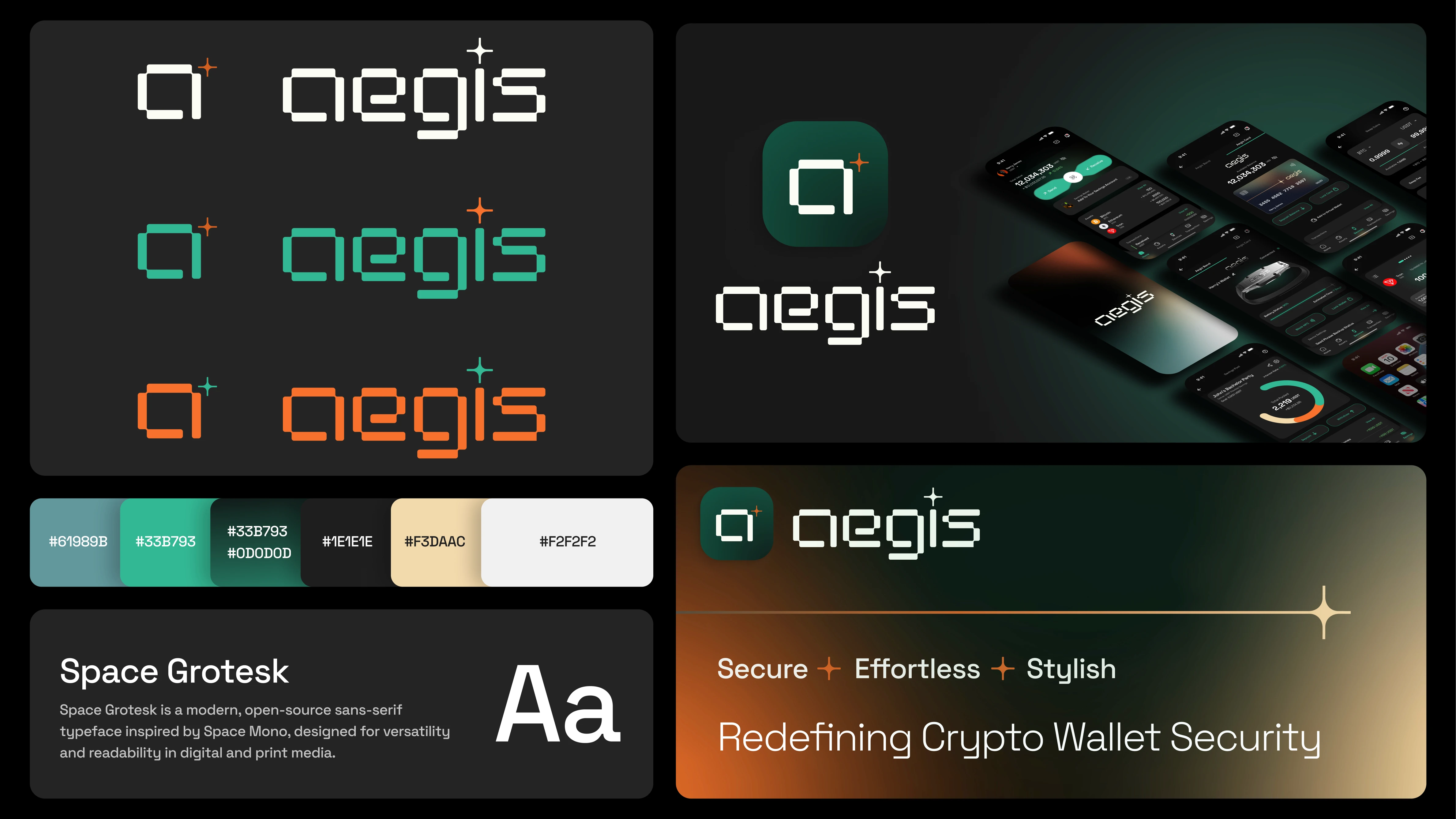 The Space Grotesk typeface, Aegis embodies security, effortlessness, and style. The branding reflects a seamless blend of innovation and elegance, redefining crypto wallet security